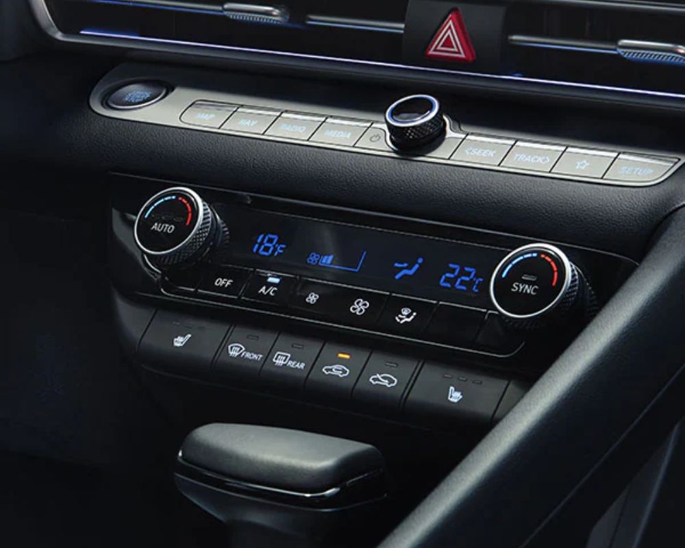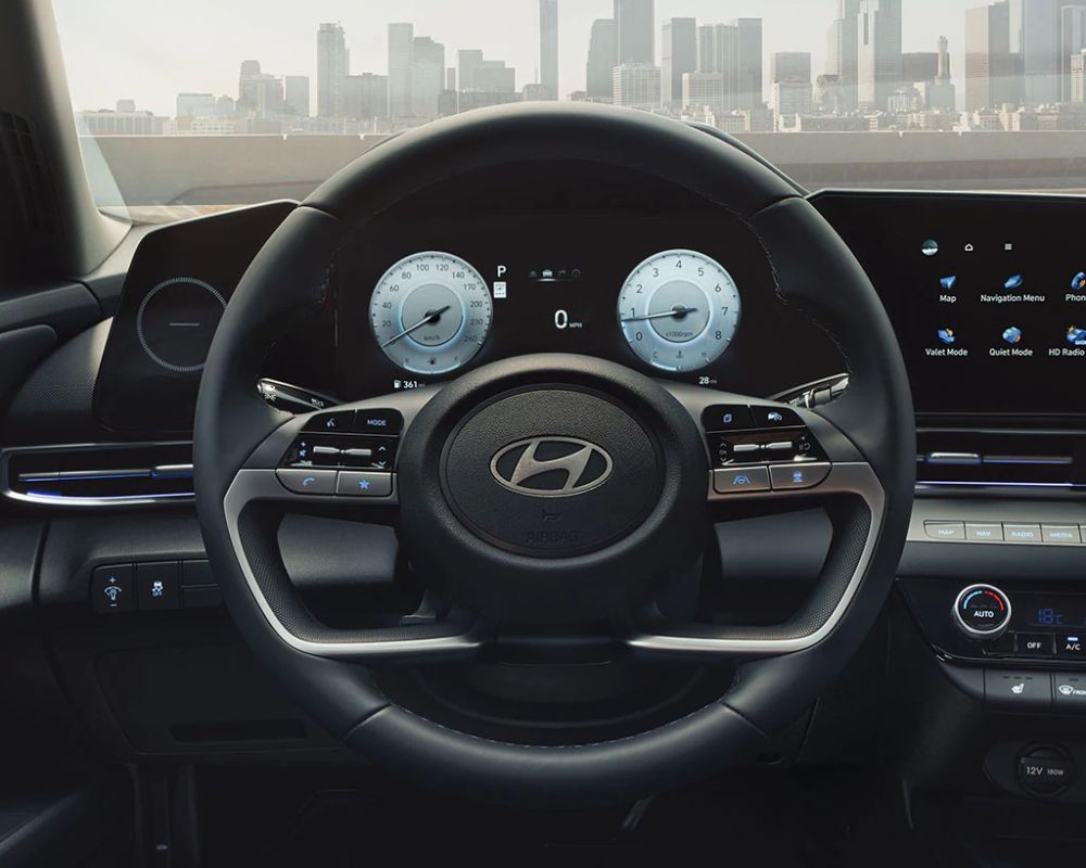 Step inside the Elantra, and you're greeted with an environment that marries comfort with luxury. Standard heated front seats offer warmth in colder weather. There’s also an available heated steering wheel. The eight-way power driver's seat with two-way lumbar support allows personalized comfort. Dual-zone automatic climate control, featuring a three-step AUTO airflow intensity, ensures drivers and passengers enjoy their ideal climate.